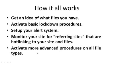 Now that you have learned the fundamentals in the previous videos, it's time to jump right in and begin to lock down your files. So in the specific video, I'm going to show you exactly that as well as examples of what people might do so you can protect yourself. Keep in mind that this only works if you have a primary layer of protection such as a membership script securing your download page.
