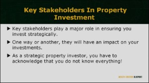 There are 2 success factors to be taken into consideration in order to be a strategic property investor. Firstly, are your key stakeholders, who play a major role in ensuring that you invest strategically. Stakeholders are people who in one way or another have an impact on you as an investor. As a strategic property investor, it is impossible for you to know everything, as time and resources are limited.