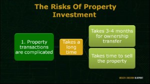 There are 3 main risks associated with real estate investment. The first risk is property transactions. It can get quite very complicated and it takes at least 3 - 4 months to complete the ownership transfer. The amount of legal documentation involved, especially regarding loan matters must be taken into consideration. It will take even longer if you are dealing with leasehold properties as it involves the state’s consent.