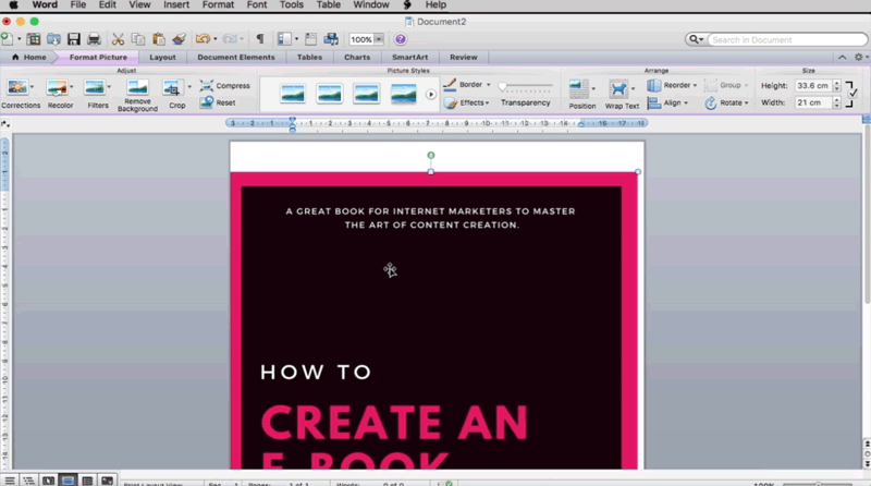 Okay. You’ve just created an awesome ebook cover on Canva.com. It’s beautiful and goes really well with the content of your ebook. You feel extremely satisfied. Now the next important step will be to insert this cover into your document.