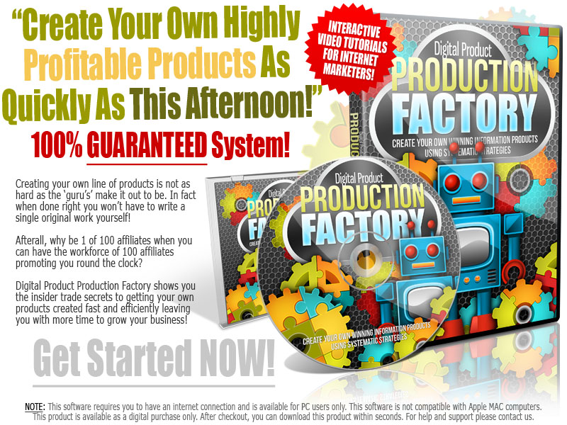Take advantage of this wonderful opportunity to make money on the internet! If you're serious about setting up your own business and expect to sell frequently, then you simply CANNOT run a successful business without the knowledge found in Product Production Factory - just ask the pros (that's if they're not too busy to answer you because they're busy making money using the same system!)