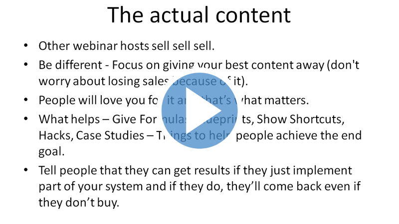 In this part of the sales webinar blueprints, we will be covering how you can convey the content or meaty part of your webinar. There is more to this section than just simply blurting out why your product/service is worth buying. So we will be showing you specific strategies that you can use to really get people interested in your product or service or business.
